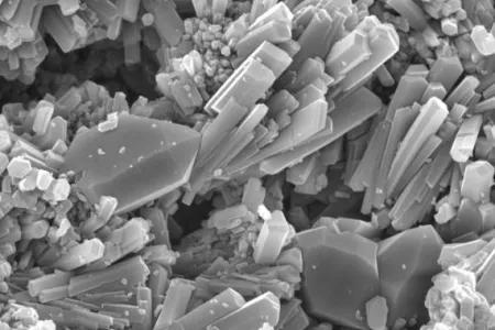 The image shows elongate plagioclase and more-equant quartz crystals grown from a starting gel with a 16 molar solution of CaCl2 and NaCl at 700ºC , 0.5 Gpa for 15 days. The image represents an area approximately 50 µm wide. Sample courtesy of Prof. Kirill Shmulovich (Academy of Science, Moscow), while working at the Department of Geology and Geophysics, University of Edinburgh. This article was published on 2024-07-01